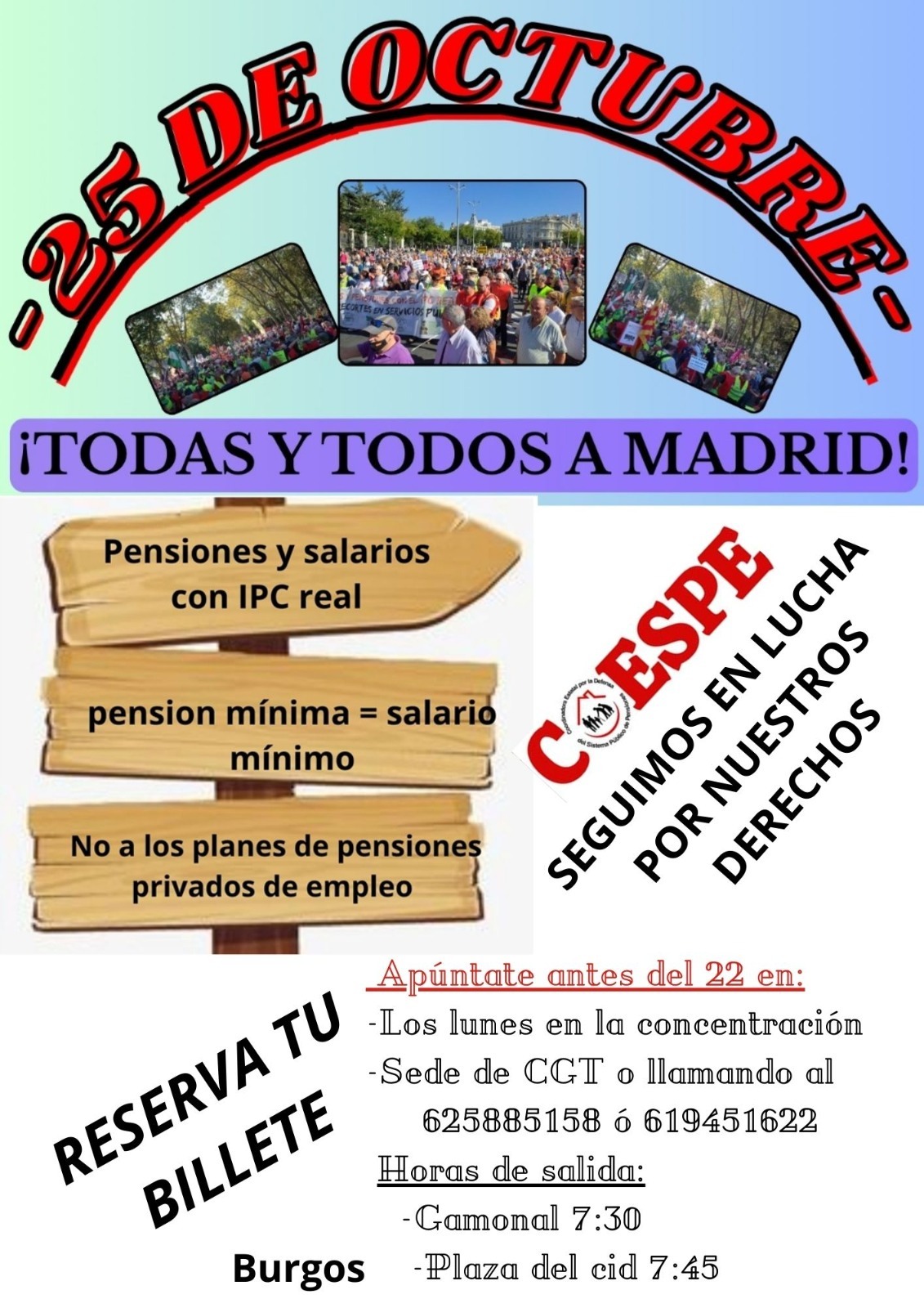 Por todo ello CGT, una vez más, ante la situación del futuro de las pensiones públicas hacemos un llamamiento a la clase trabajadora, trabajadores/as actualmente en activo y pensionistas, a caminar juntos y acudir a la manifestación del 25 de octubre en Madrid para defender el Sistema Público de Pensiones como un derecho inalienable.